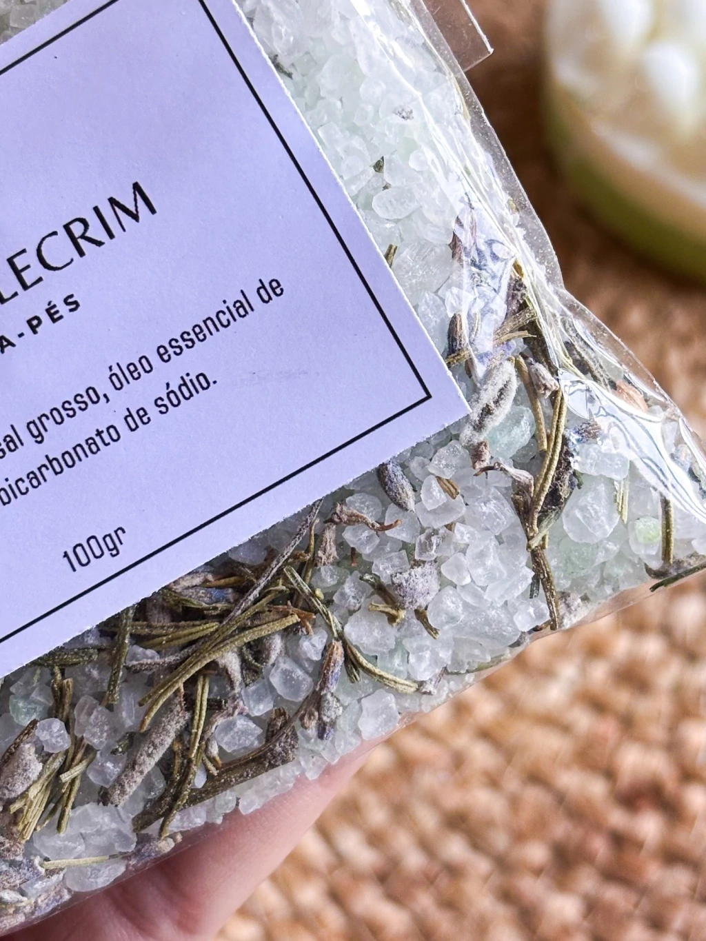 Com sal grosso, ervas desidratadas, óleo essencial de alecrim e óleo essencial de melaleuca, além de bicarbonato de sódio. Benefícios na pele: o alecrim estimula a circulação e revigora, enquanto a melaleuca tem ação antisséptica natural, purificante e cicatrizante, ajudando a manter os pés livres de impurezas e odores. O bicarbonato suaviza e amacia a pele, proporcionando alívio imediato ao cansaço.